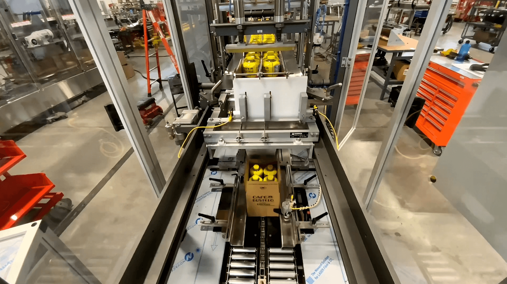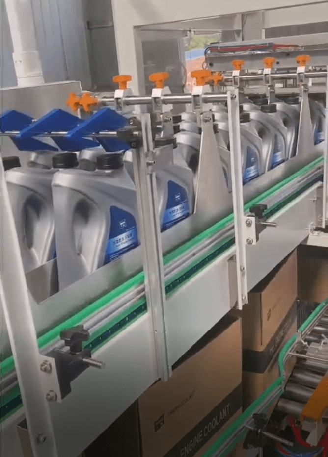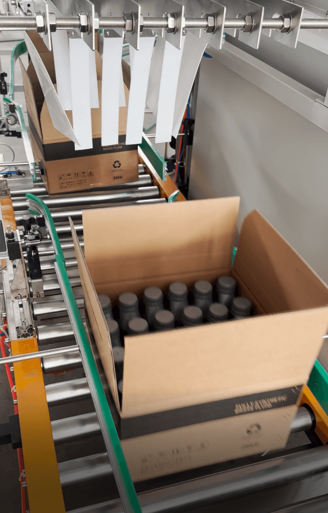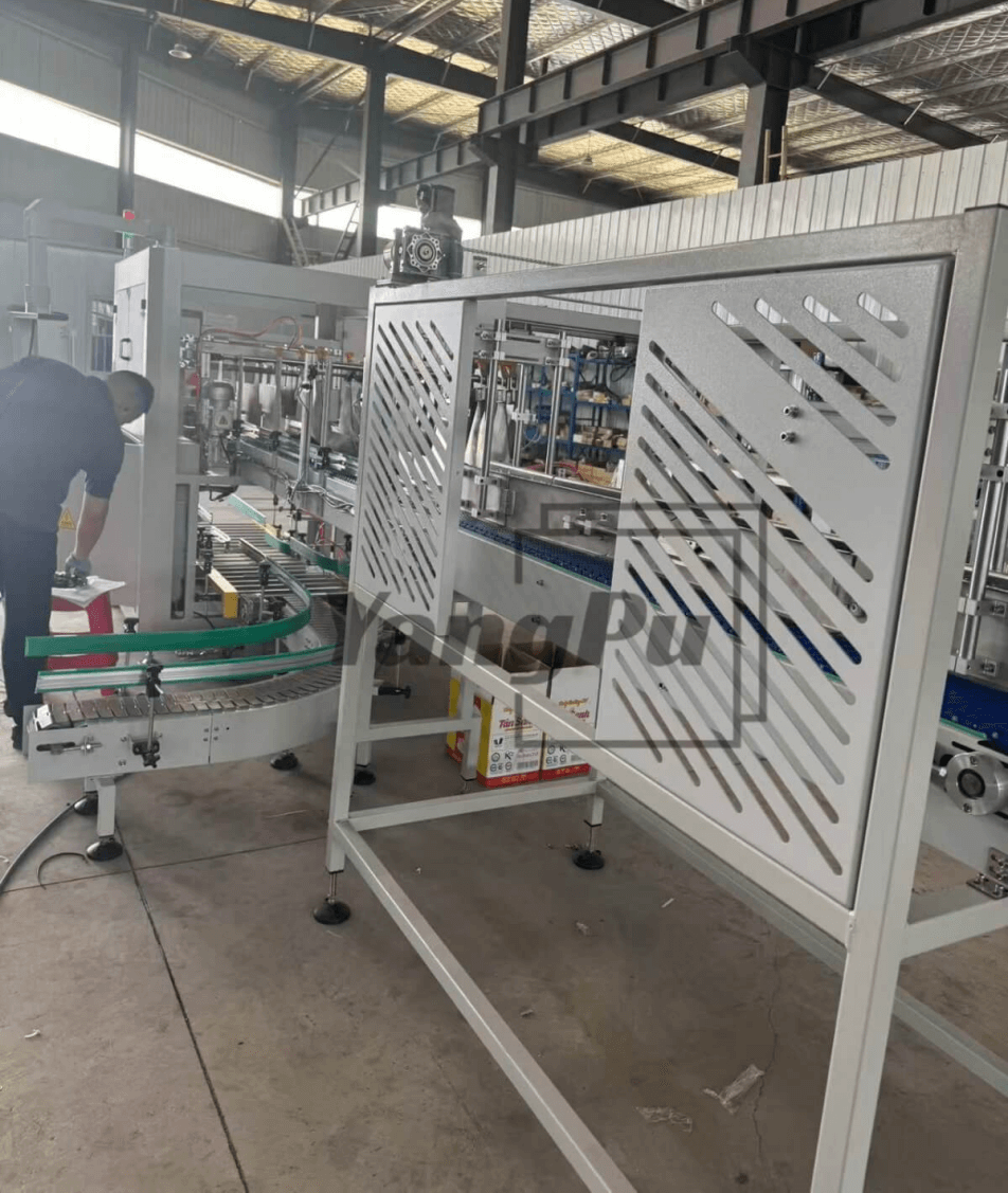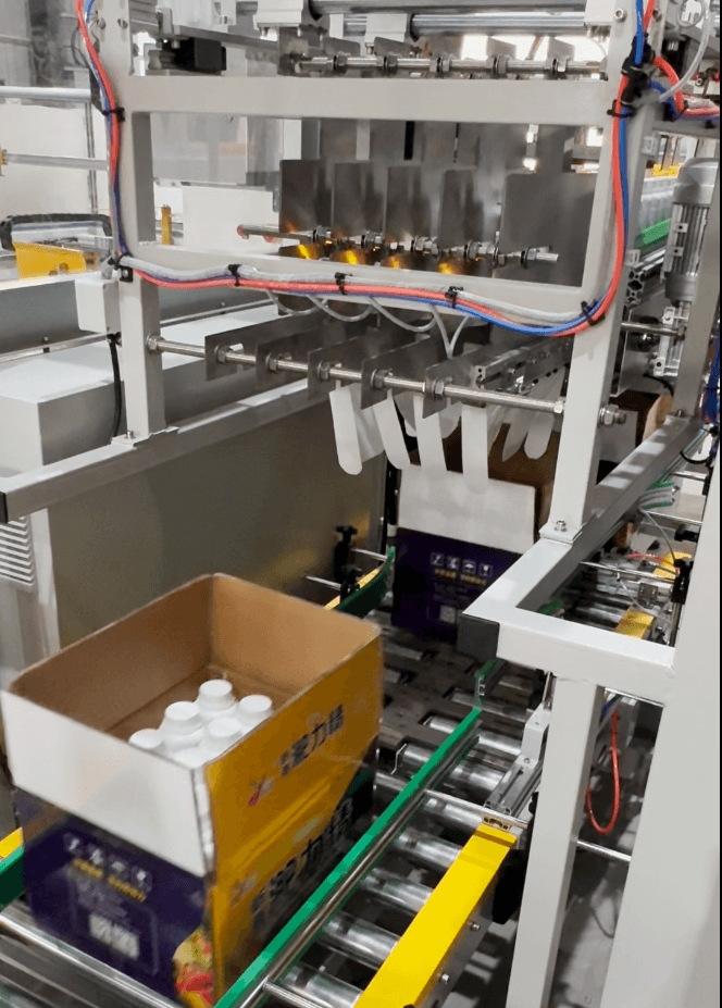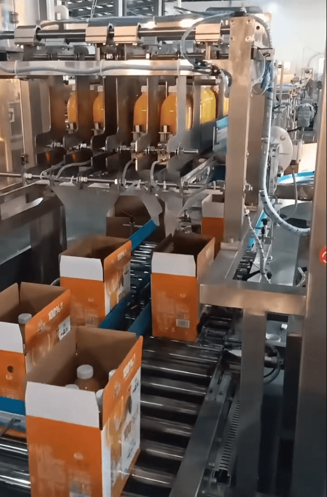 The drop-type case packing machine is an economical solution for packing bottles or cans into cartons. Products are grouped and then dropped into cartons efficiently.
